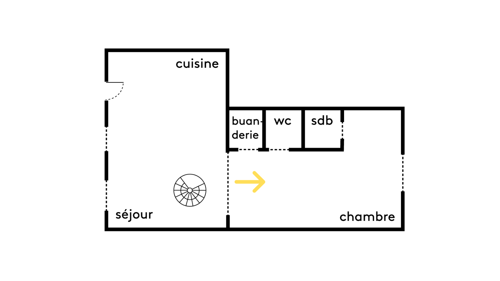 La chambre, tournée côté cour, bénéficie d’un calme agréable, à l’écart de l’agitation. À gauche, deux portes discrètes mènent respectivement à la buanderie et aux WC, pratiques au quotidien. La pièce de vie et l’espace nuit sont séparés par un élégant claustra en bois, qui préserve l’intimité tout en laissant passer la lumière et en apportant une touche graphique chaleureuse à l’ensemble.