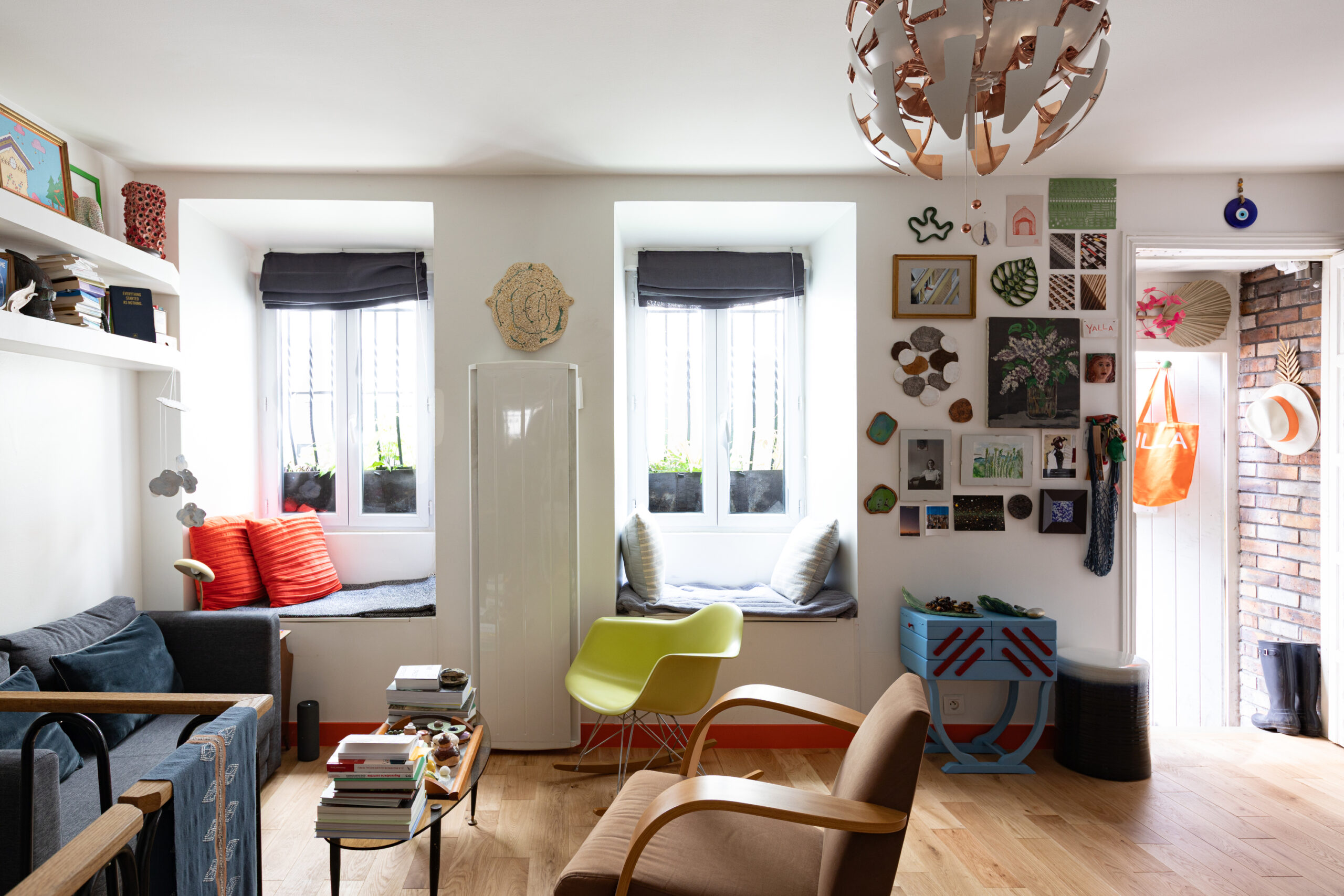 Retour dans la pièce de vie, où la belle luminosité est mise en valeur par une banquette-coffre installée au pied des fenêtres. Les jardinières apportent intimité et une touche bucolique, presque inattendue en plein Paris, tandis que le double vitrage assure une insonorisation optimale.