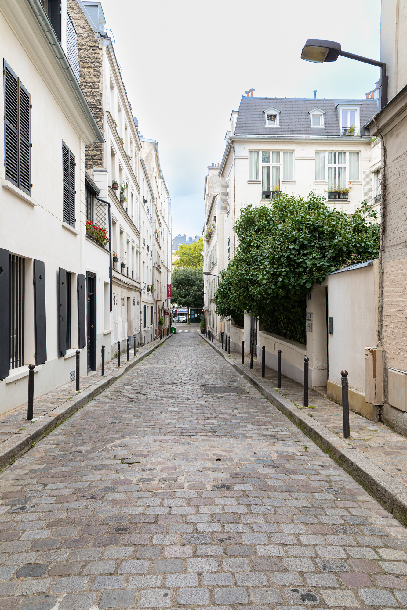 Une charmante impasse pavée, bordée d’immeubles parisiens aux volets traditionnels et aux façades claires, qui mêle calme et authenticité au cœur du bouillonnant Pigalle.