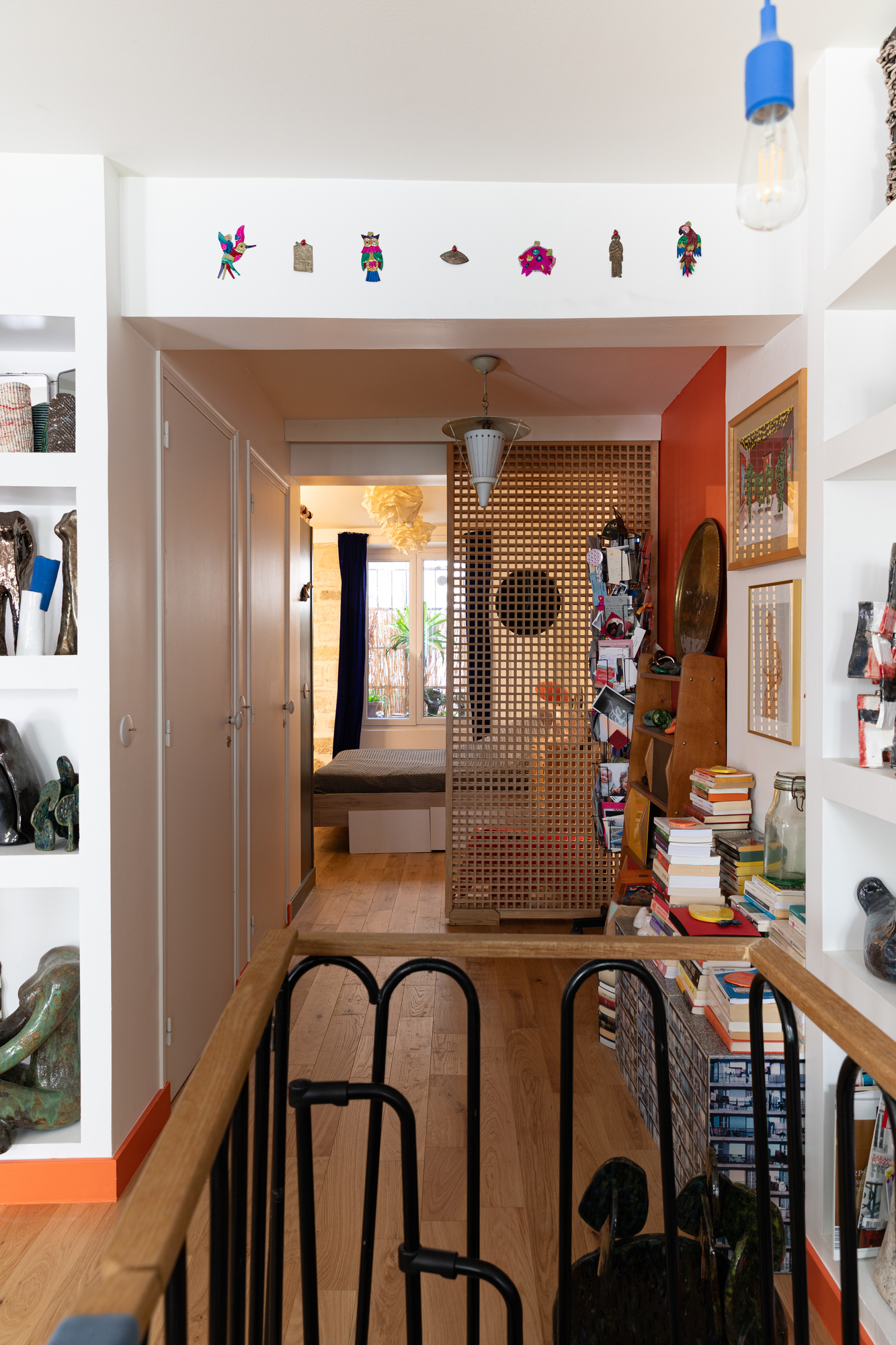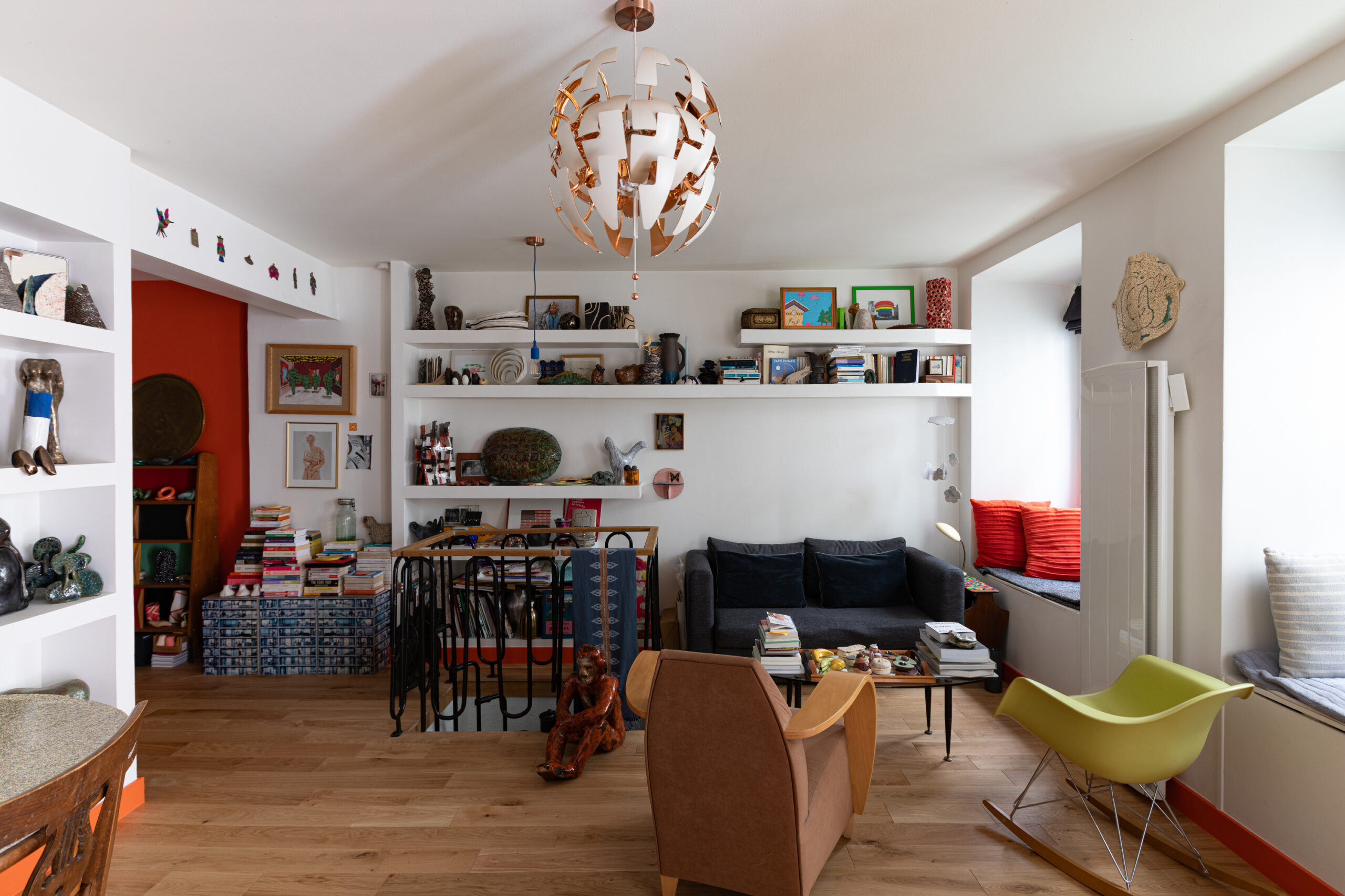 Côté salon, une bibliothèque encastrée et maçonnée sur mesure structure l’espace. Le garde-corps, sécurisé et réalisé par un artisan d’après un dessin de Tara, apporte une touche unique et personnelle. Mais où mène-t-il ?