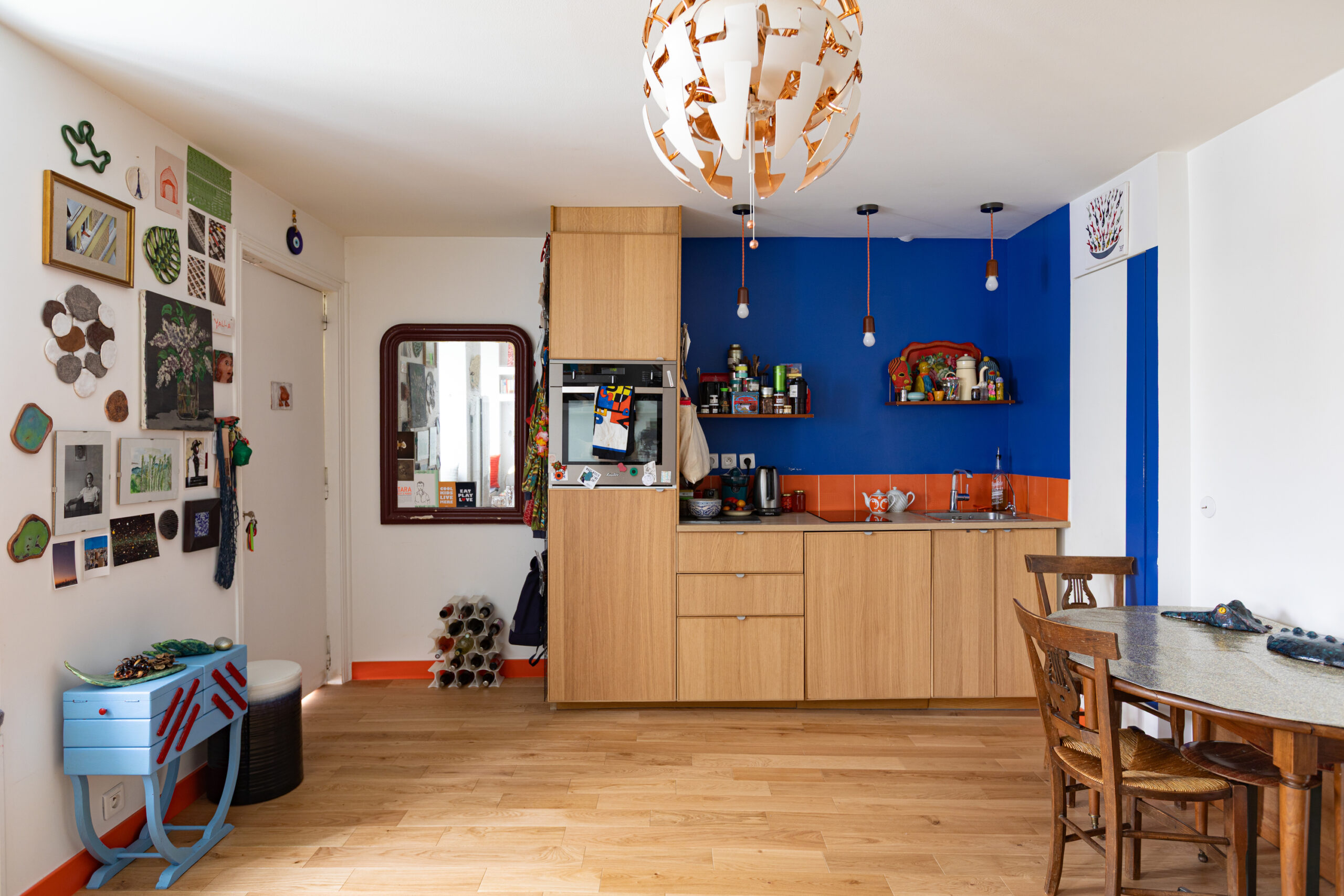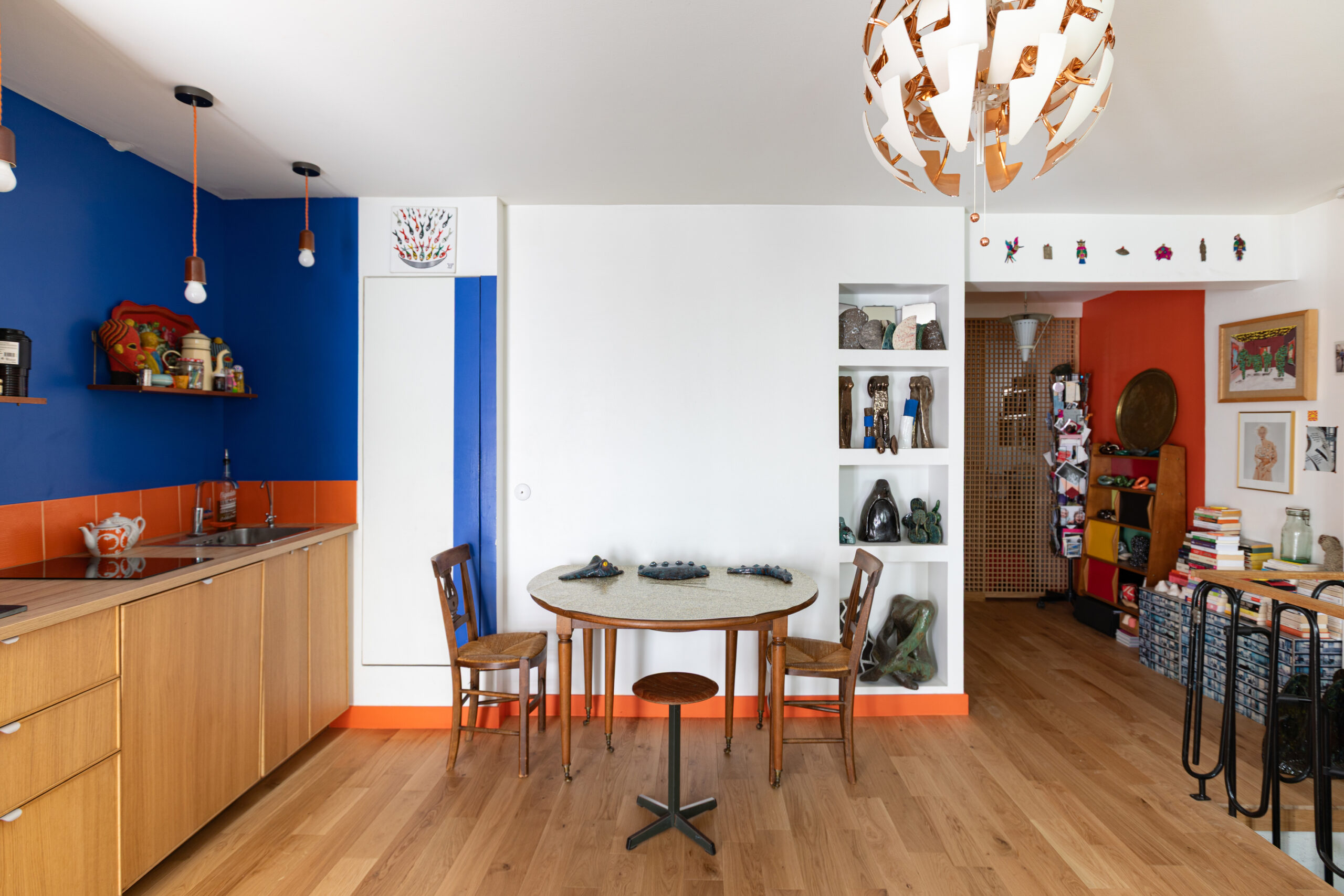 Bienvenue dans la pièce de vie, lumineuse et conviviale, où le parquet en chêne clair s’anime de touches colorées. Modulable à souhait, l’espace se prête aussi bien aux repas intimes qu’aux grandes réceptions : Tara y a déjà accueilli treize convives à table… et près d’une cinquantaine lors d’un vernissage de ses céramiques.