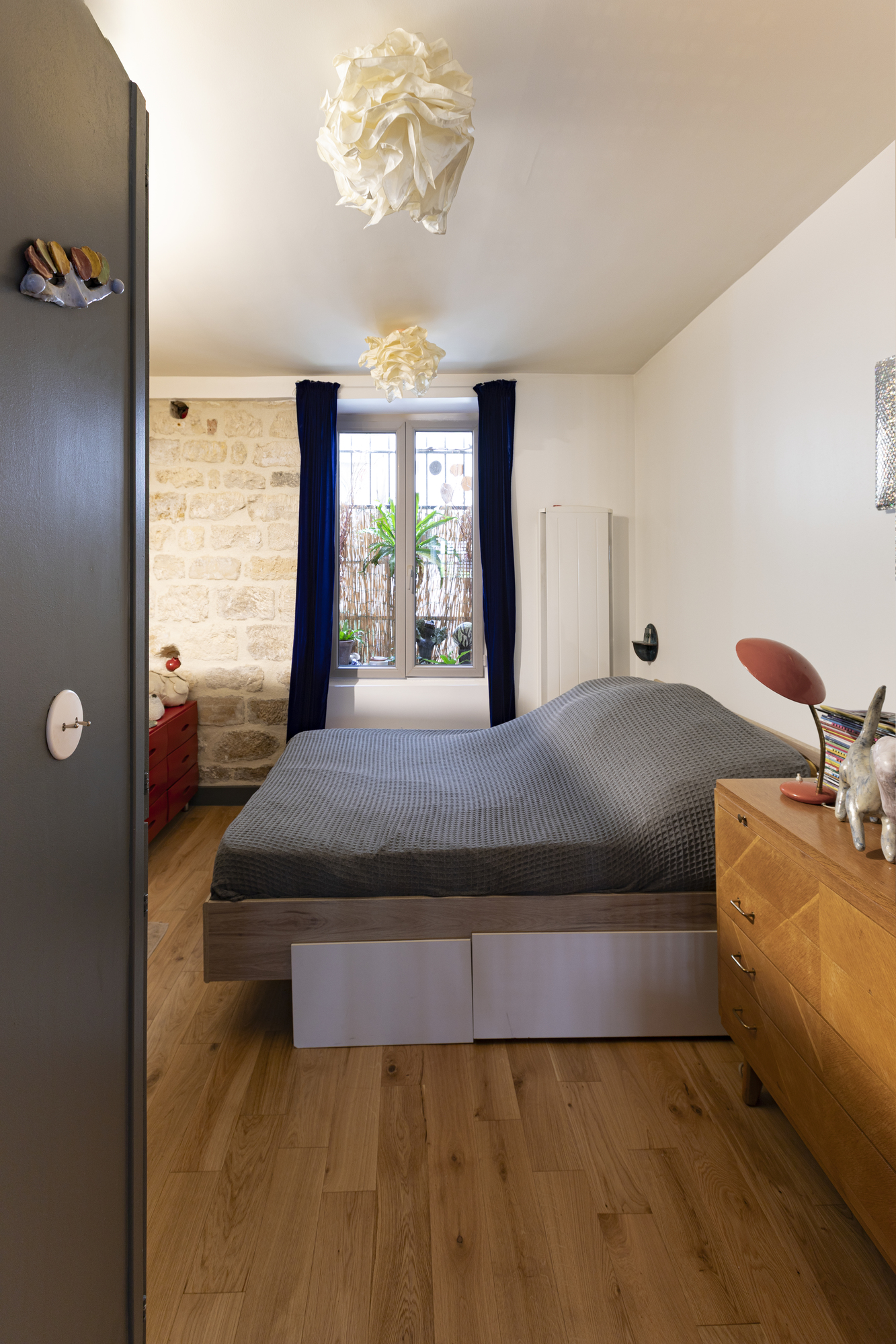 La chambre, spacieuse et chaleureuse, reprend le même parquet en chêne que le reste de l’appartement. Son mur en pierre apparente souligne le caractère historique du lieu, tandis qu’une grille discrète et des plantes en façade garantissent à la fois sécurité et intimité.