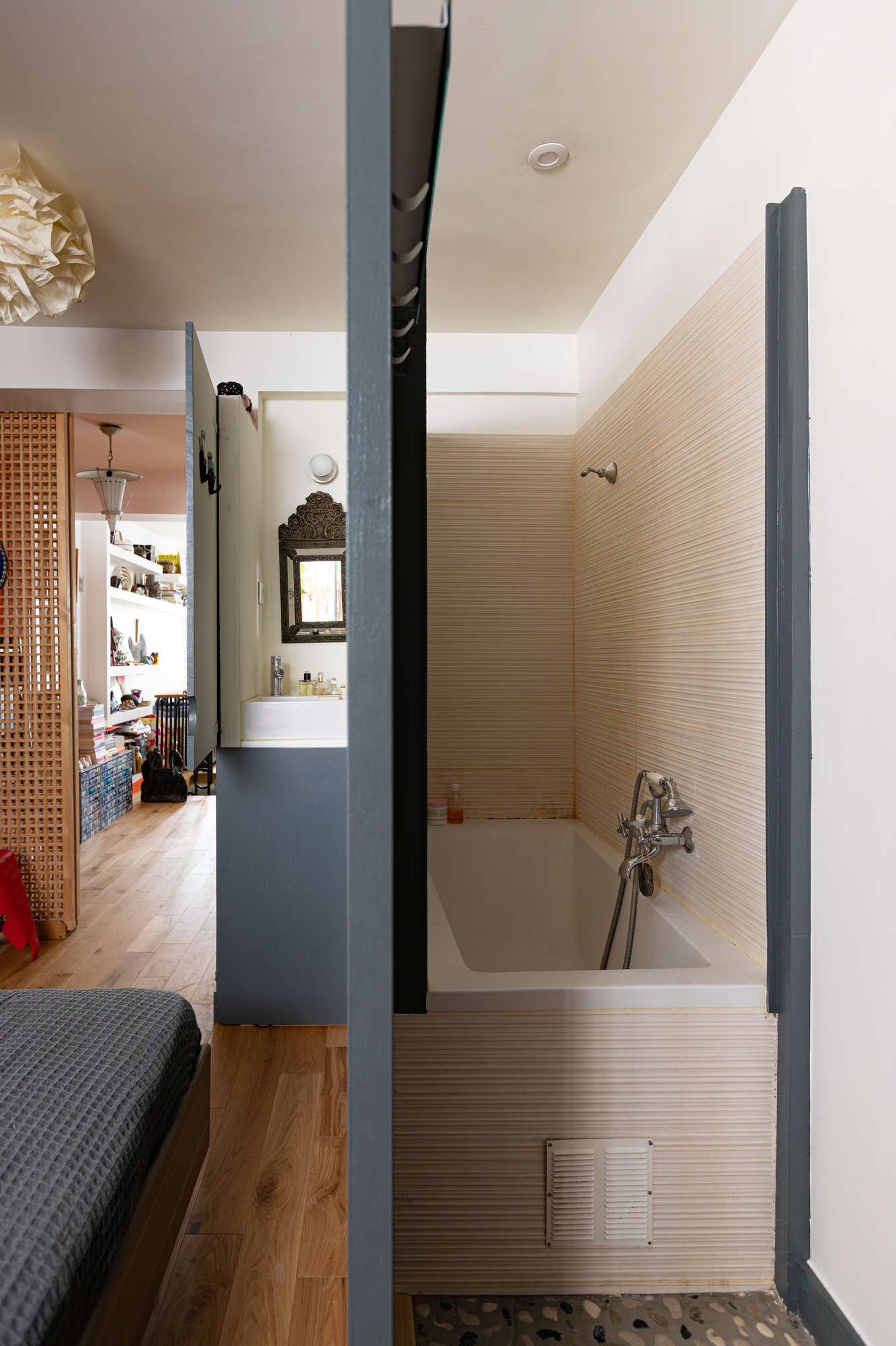 L’ensemble astucieux se révèle : Tara, passionnée de bains, tenait absolument à intégrer une baignoire. Pari réussi dans cet espace compact ! L’esprit évoque une cabine de piscine, avec suffisamment de place devant la baignoire pour se changer confortablement, même porte close.