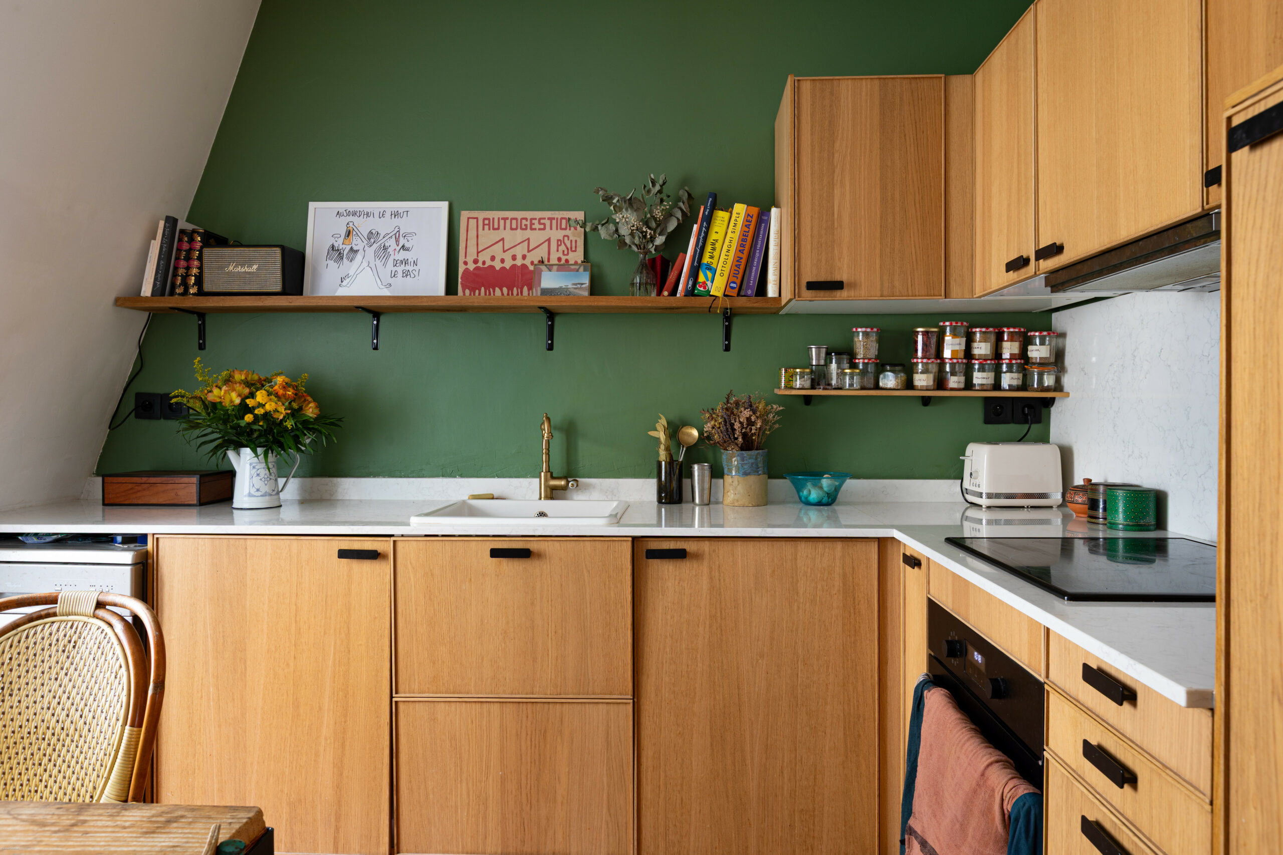 La cuisine s’organise autour d’un plan de travail blanc de qualité, qui capte et réfléchit la lumière naturelle. Il contraste avec le mur vert et les meubles en bois, tandis que les poignées noires viennent souligner l’ensemble avec discrétion.